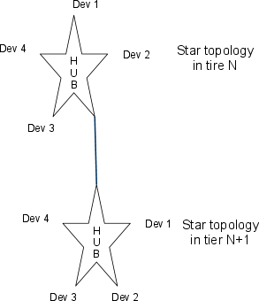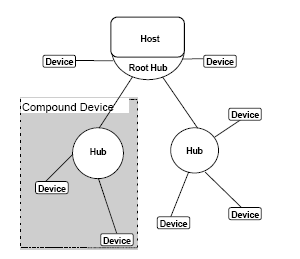 主机位于层级结构的顶端,所有“功能”最终都连接到主机。“hub”用于扩展“root hub”(主机的最终端点)的连接性。hub是每一层级的中心,每一层级都以hub为中心构建星型拓扑结构。