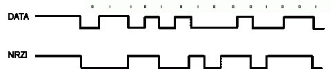 USB协议采用电缆D+和D-线上的差分信号传输。数据使用NRZI协议编码,并以J(电流流入D+线)和K(电流流入D-线)表示。
