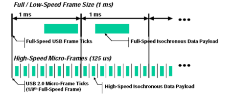 USB 通信以帧的形式进行。每个帧可以包含发往多个设备的传输。带宽是指在 1 毫秒/125 微秒的帧中分配给特定设备的时间。考虑到传输速度模式(1.5/12/480 Mb/s),带宽可以转化为数据量。