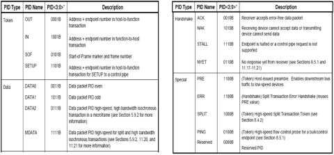8 位 PID 实际上由一个 4 位 PID 和一个 4 位 PID 补码构成,如下图所示。如果出现不匹配,设备将不会响应,并且主机端会发生超时(参考:USB 2.0 规范的 8.3.1 节)。