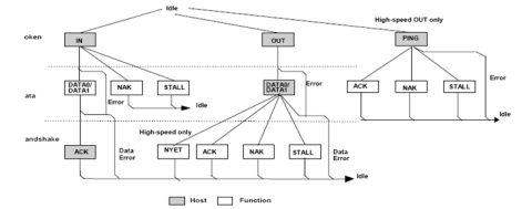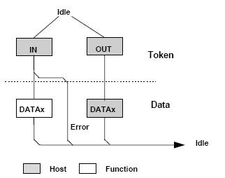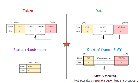 - 令牌阶段(token stage:):主机向目标设备发出令牌数据包(token packet),以便进行后续通信。该令牌数据包还指示传输方向。