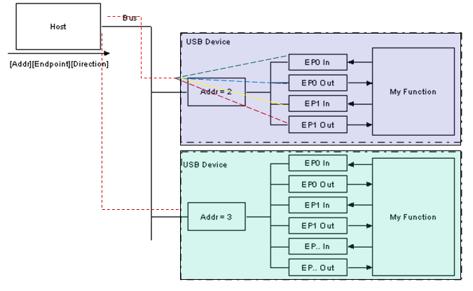 一旦多个设备连接到拓扑结构,主机就会给每个设备分配一个唯一的 7 位地址。为此,初始通信将使用设备地址 0(设备在获得实际设备地址之前的默认地址)。主机和集线器之间会协作防止使用地址 0 进行设备寻址。