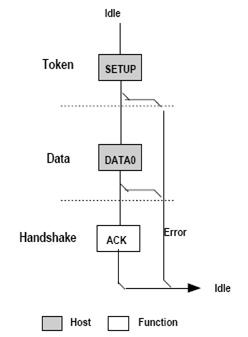 建立阶段从主机发送的建立令牌(setup token )开始,然后是包含实际命令信息的数据包,随后是确认阶段。