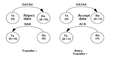 但是,如果出现问题导致数据不被接受(发送 NAK),则主机和设备会保持序列位状态,并使用前一个数据令牌类型立即进行下一次传输。