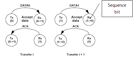 在进行数据传输时,主机使用两种类型的数据令牌,分别是 Data0 和 Data1。初始数据传输使用 Data0 令牌。收到设备的 ACK 确认后,下一条数据将使用 Data1 令牌发送。设备还维护一个序列位,该序列位在成功确认传输后会被翻转。