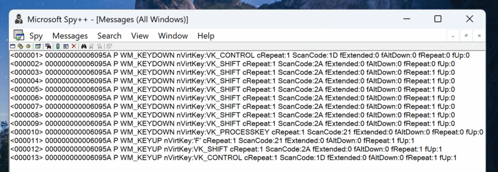 2.选中最上的面的窗口,Windows的设计消息是一级一级传下去的,最上层收到后如果处理不了会 pass 给下面,我们直接在最上层监听看看谁收了按键没有下发
