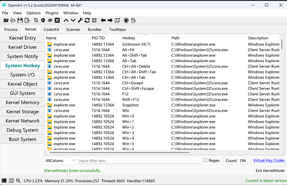 2. OpenArk 有局限性,不能举出系统中的所有快捷键